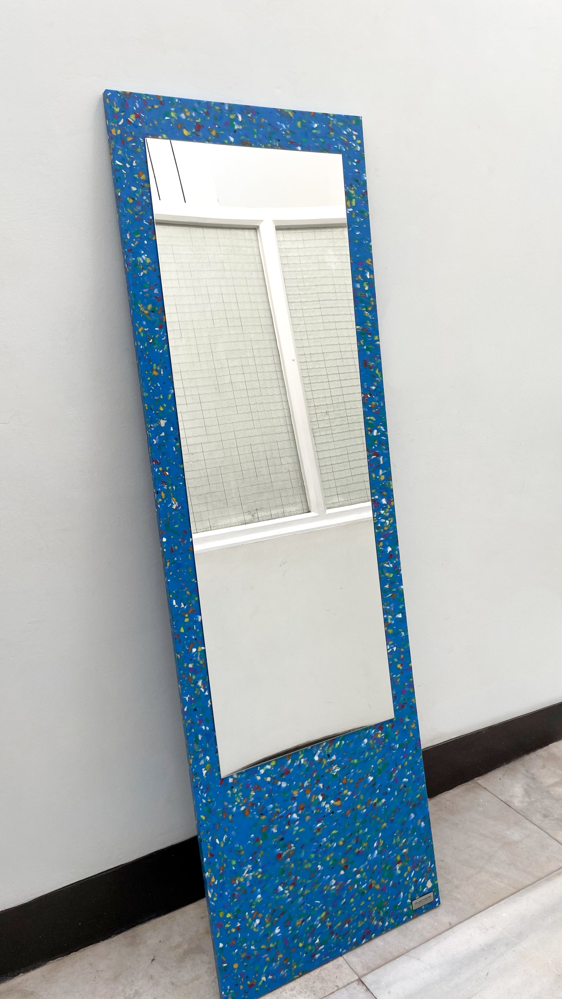 Objeto de decoració. Espejo de pie de diseño minimalista, realzado por un marco de plástico reciclado con acabado azul. Su formato rectangular y vertical (160×50 cm) amplía visualmente el espacio y aporta luminosidad, convirtiéndolo en un elemento funcional y decorativo. Se integra fácilmente en dormitorios, vestidores o recibidores y se apoya directamente en el suelo. Cada pieza es única.