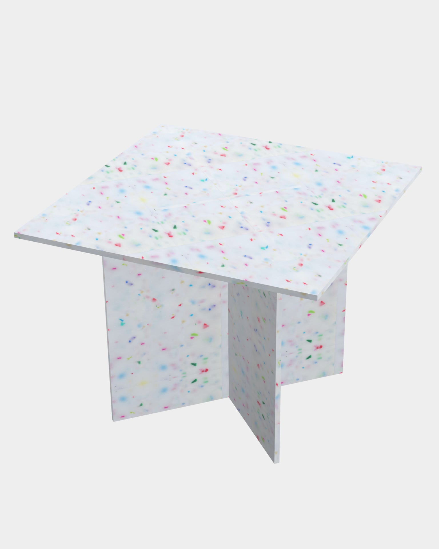 Es una pieza de diseño ideal como mesa de comedor o para espacios amplios que requieren una solución con carácter. Fabricada en España a partir de plástico reciclado de origen local, se compone de varias piezas planas que se ensamblan fácilmente como un puzzle, sin necesidad de herramientas ni elementos adicionales. Su diseño modular, junto con su presencia llamativa, la convierten en una opción versátil y sostenible para espacios modernos.