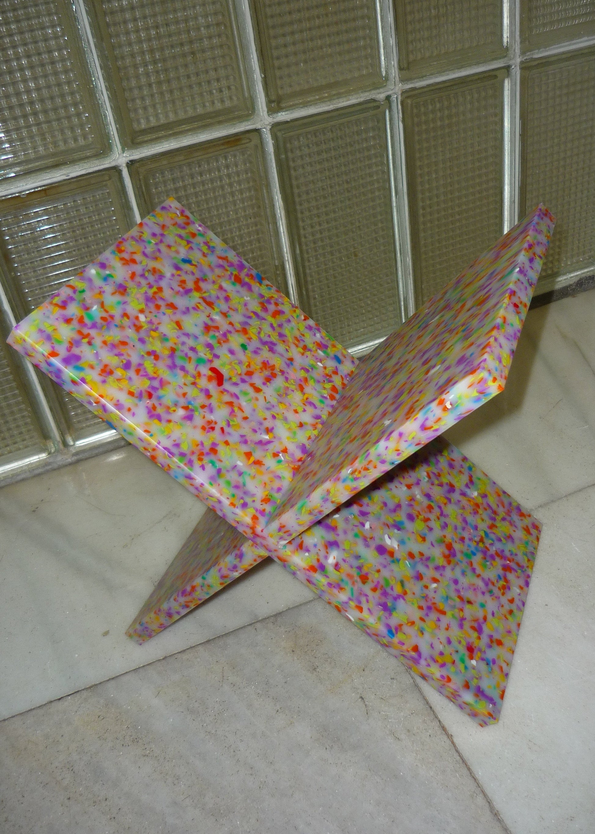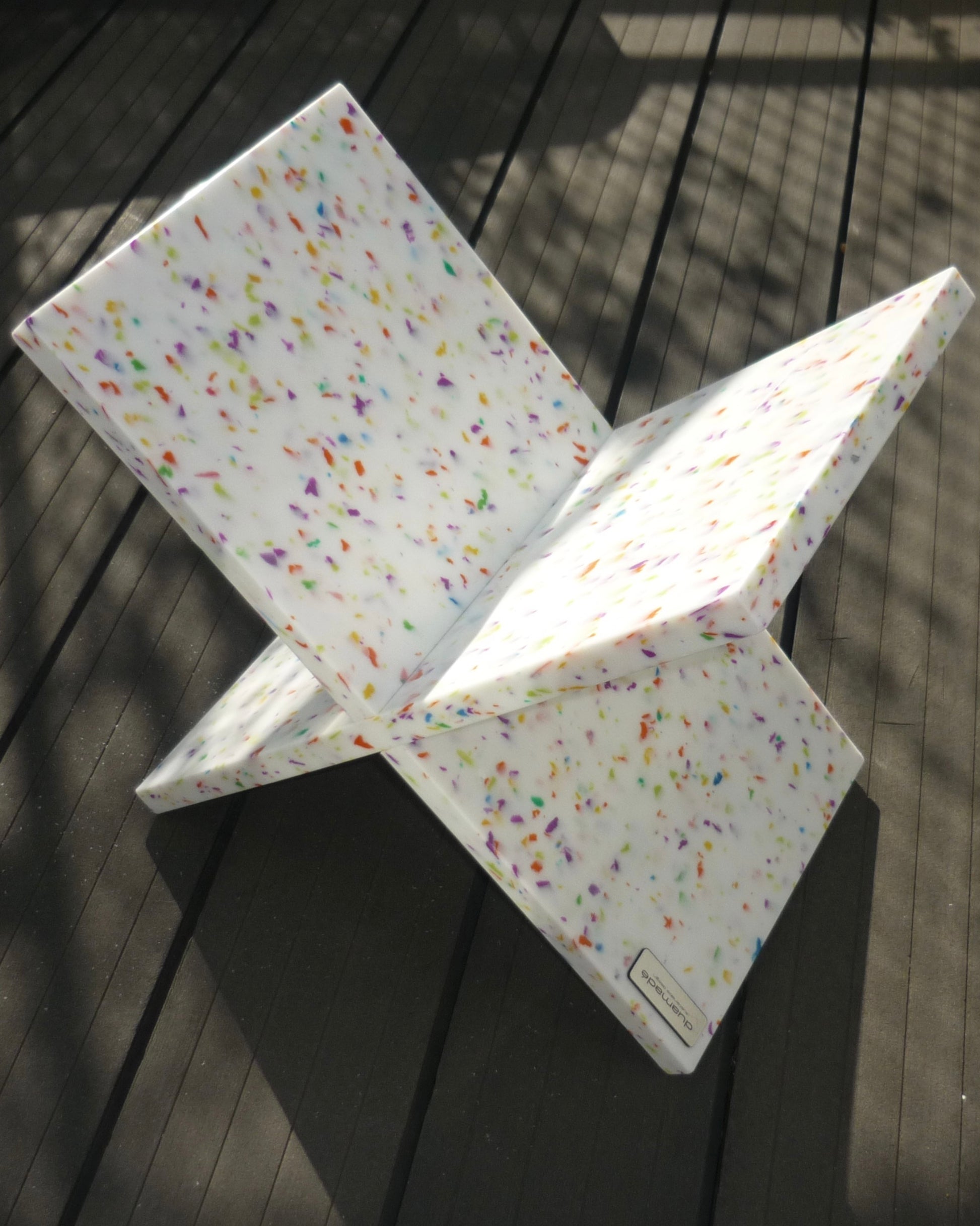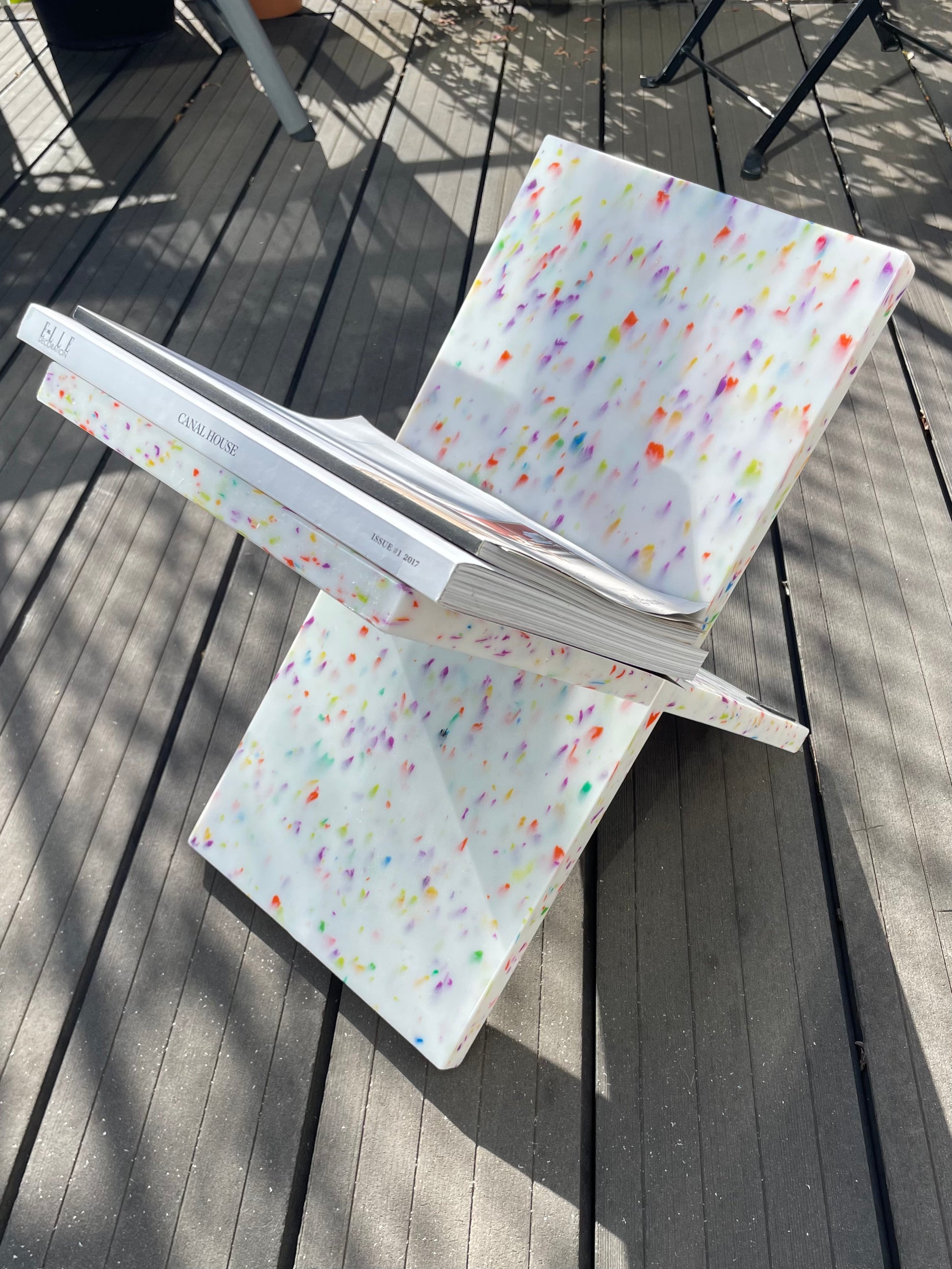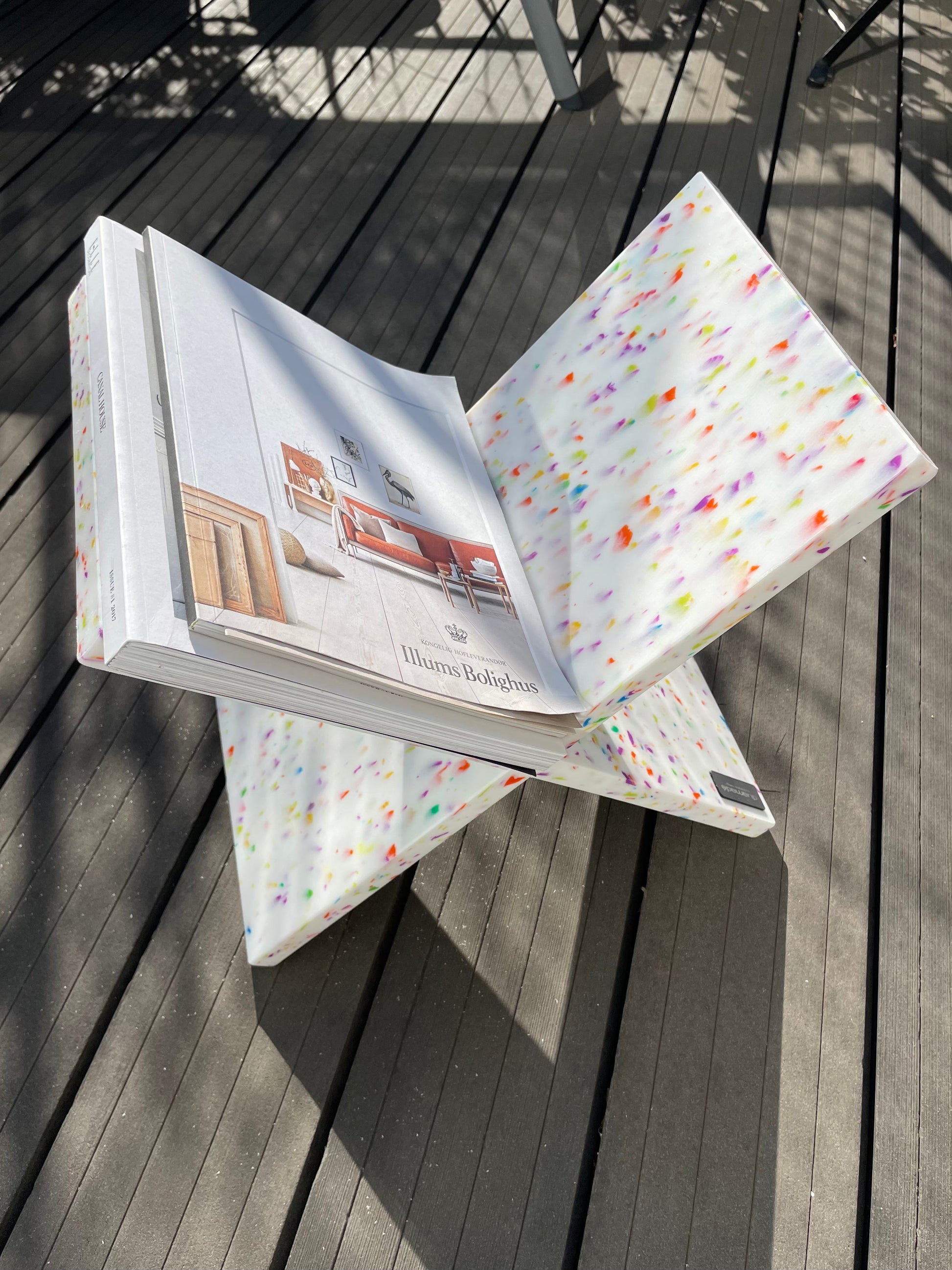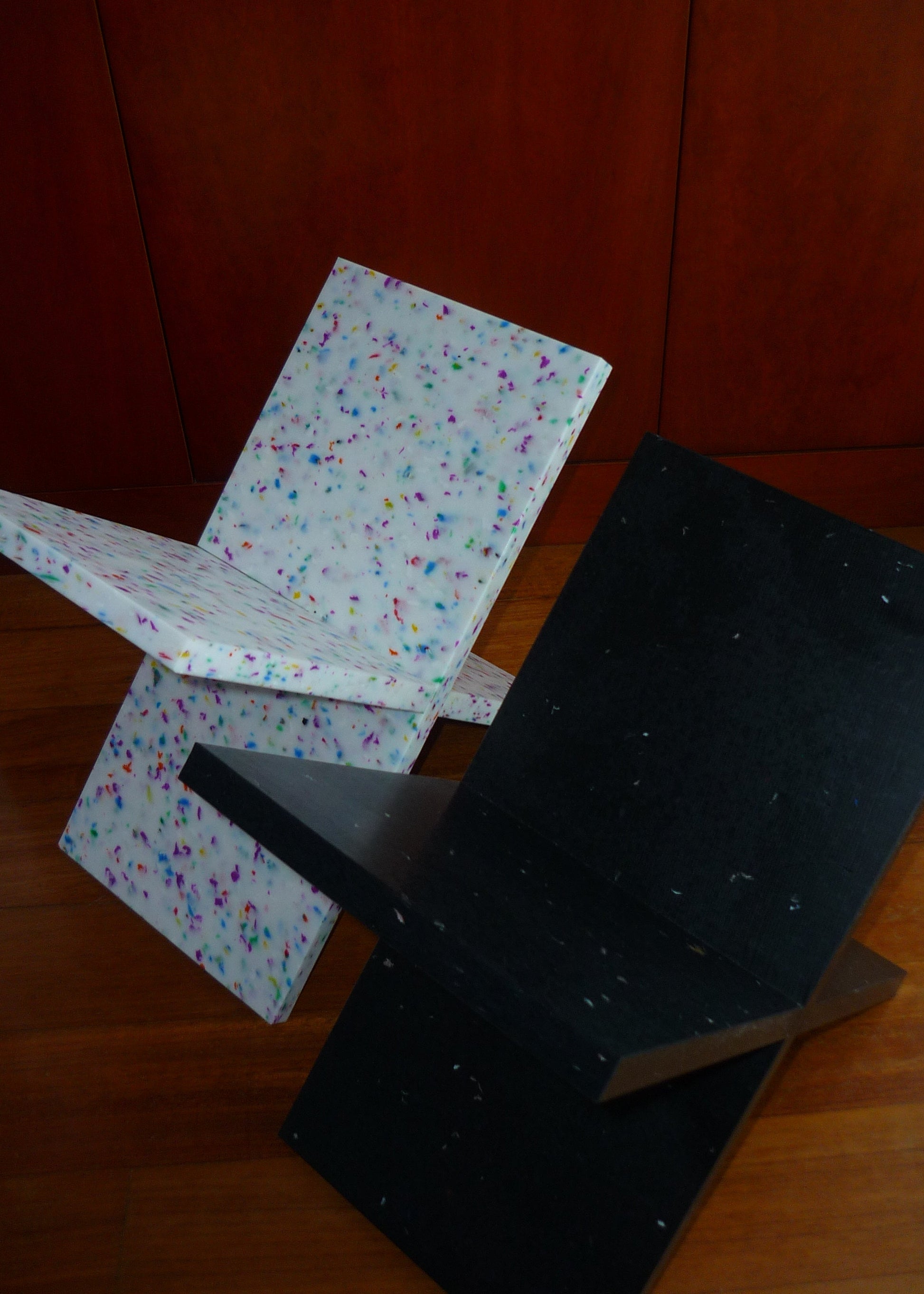 Objeto de decoración. Plástico reciclado. Dos piezas que encajan como un puzzle y se montan sin tornillos ni herramientas. Diseño minimalista, estable y funcional para ordenar revistas y libros. Cada pieza presenta un moteado único.