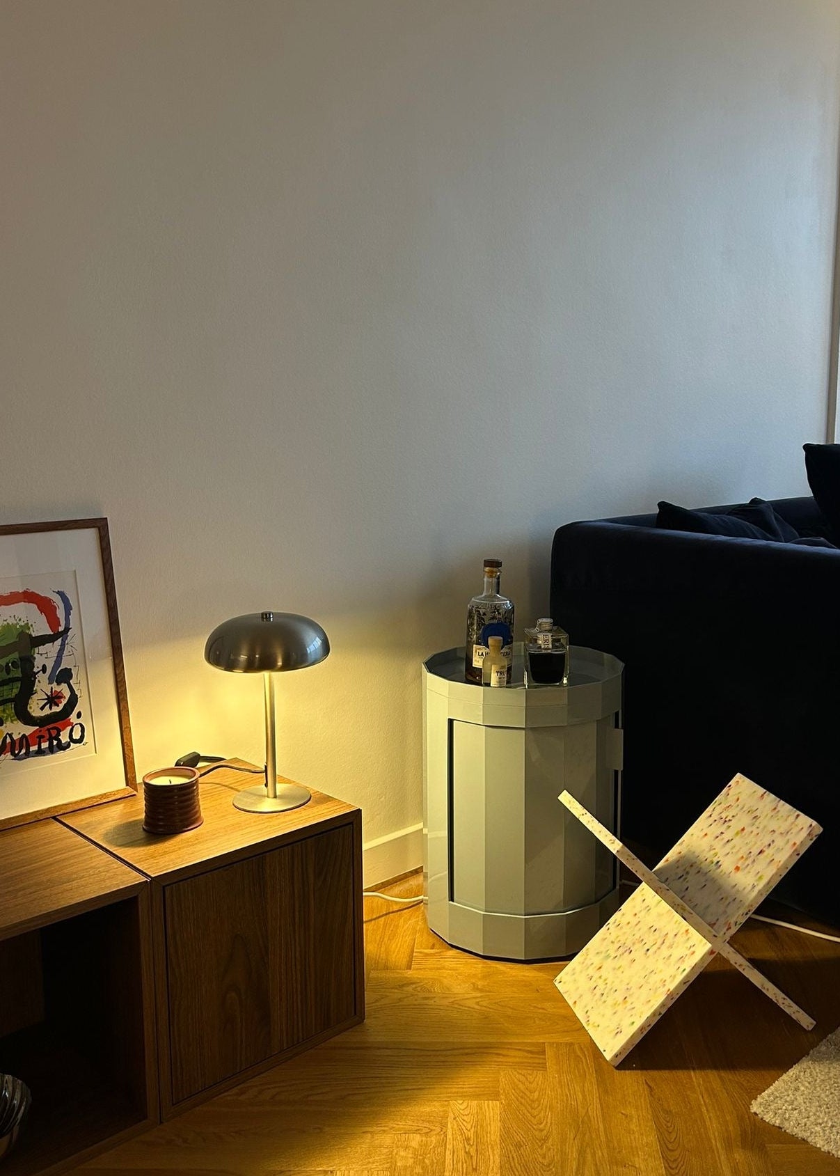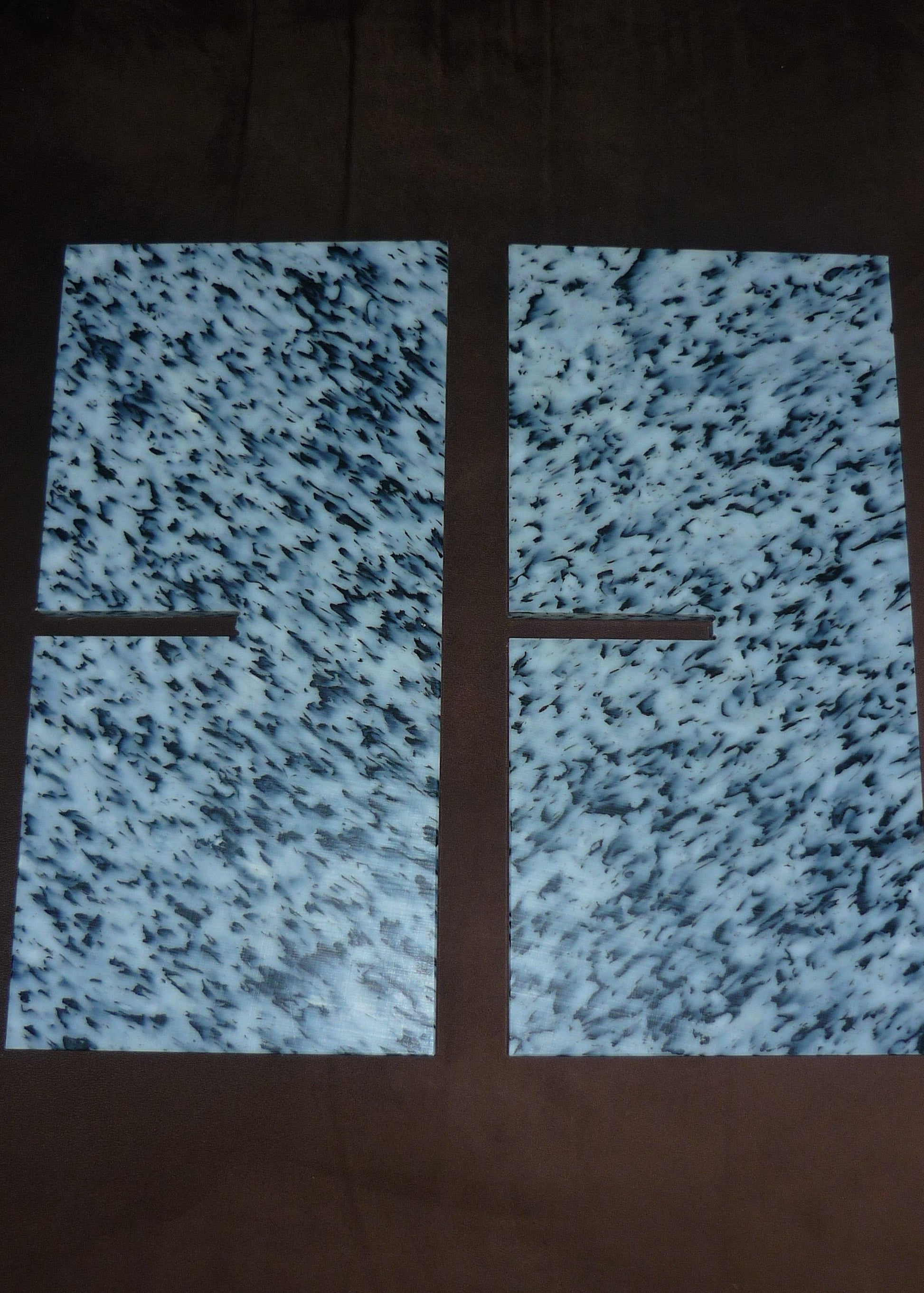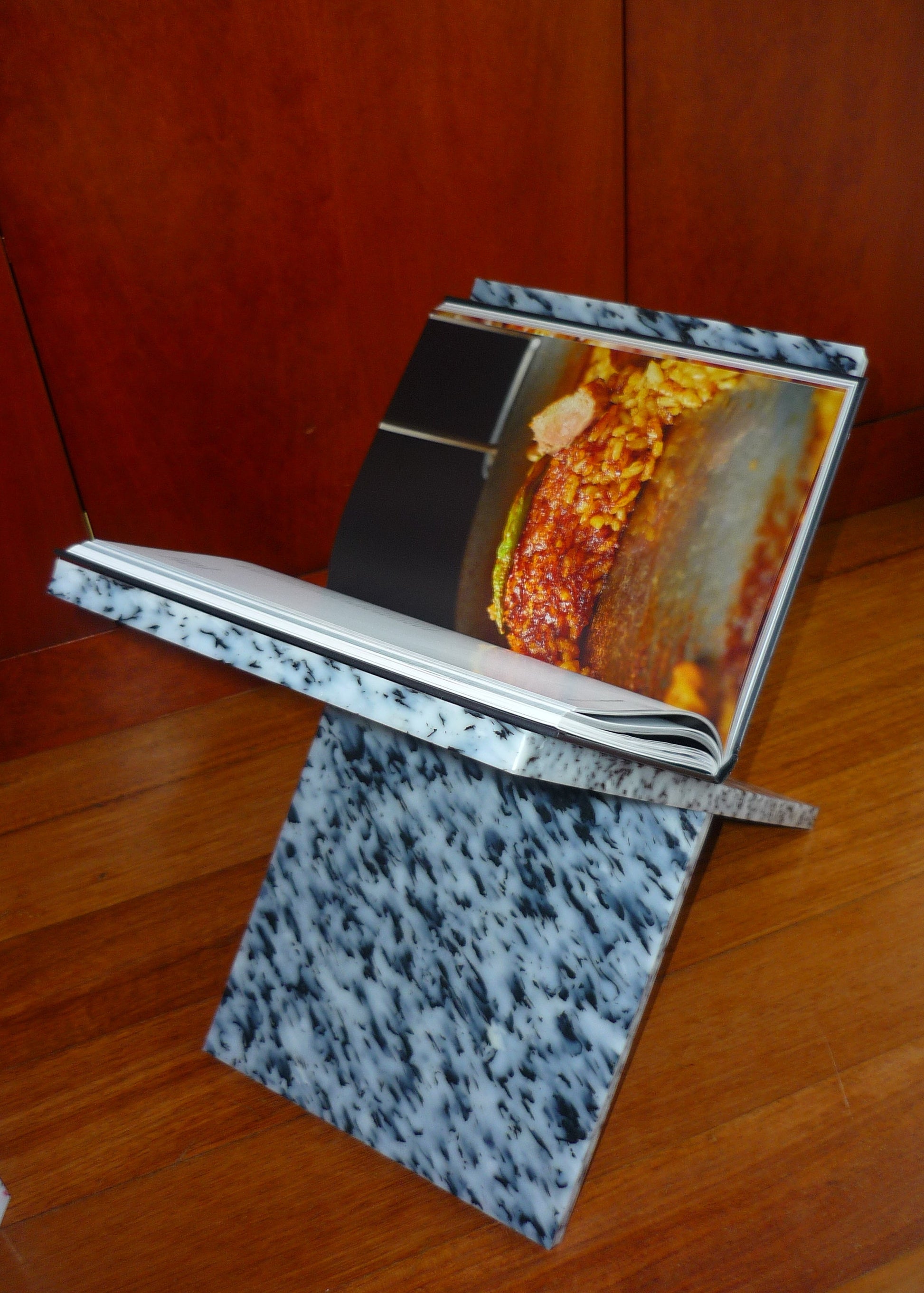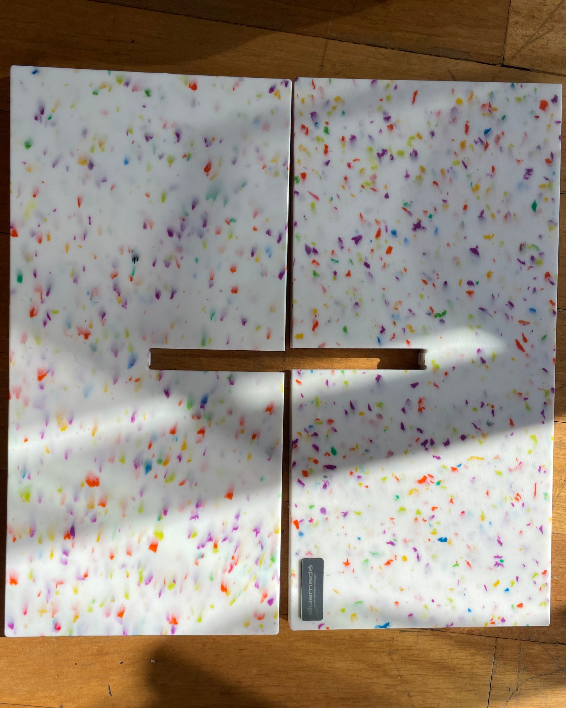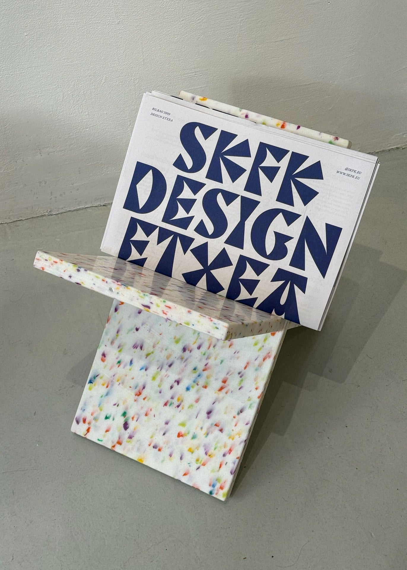 Objeto de decoración. Plástico reciclado. Dos piezas que encajan como un puzzle y se montan sin tornillos ni herramientas. Diseño minimalista, estable y funcional para ordenar revistas y libros. Cada pieza presenta un moteado único.